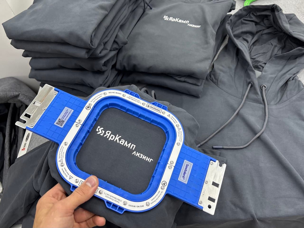 Задача: Вышивка текстового логотипа на 30 серых толстовках с капюшоном